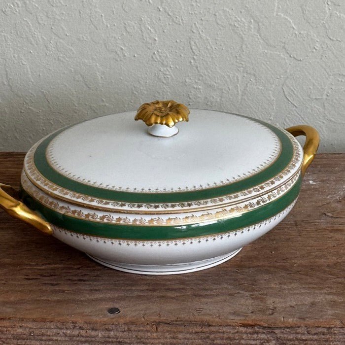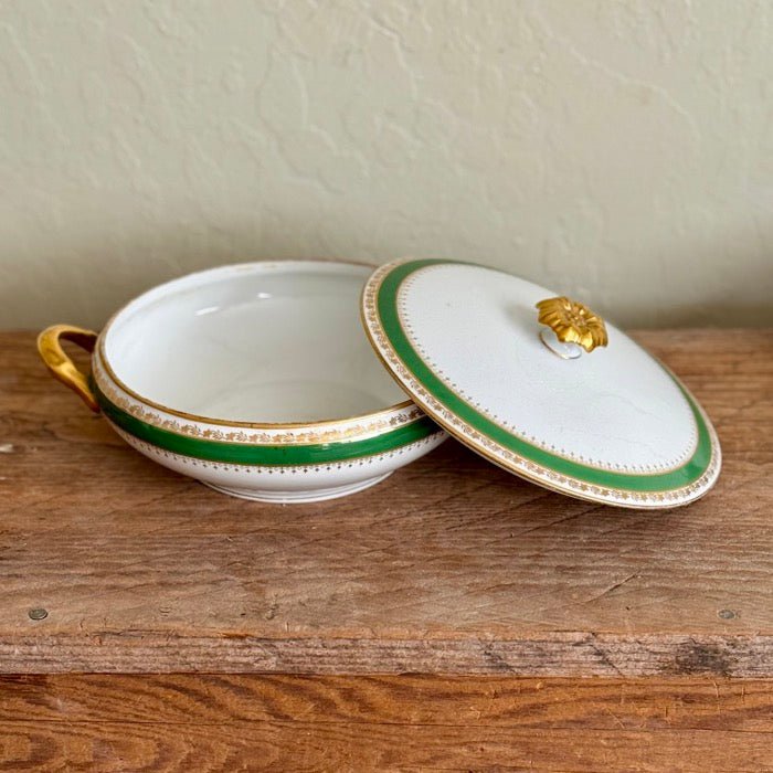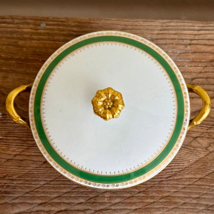 This beautiful vintage limoges dish is wonderful, with stunning gold trim and green coloring.