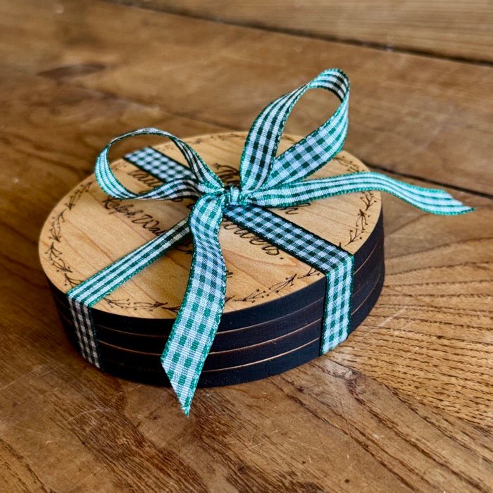 Garden Wisdom Coasters | American Maple + Green Gingham Ribbon | Set of 4 - The Celtic Farm